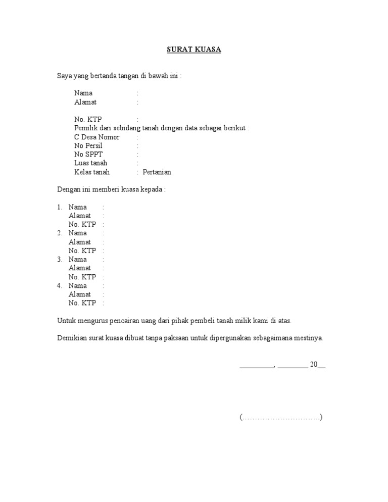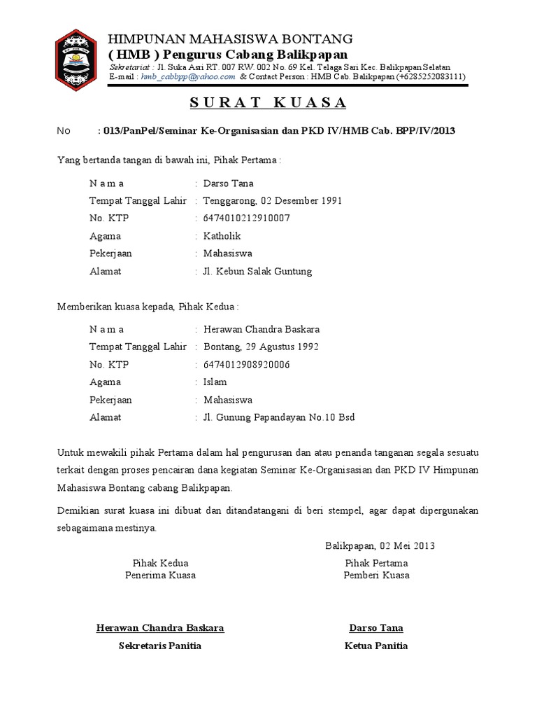 Tiap-tiap jenis surat tentu memiliki tujuan yang berbeda-beda. 1. Surat kuasa personal (perseorangan) Kalau kasusnya untuk mengambil dokumen di kantor polisi kayak kasus di atas, kamu hanya perlu surat jenis ini. Bisa juga digunakan untuk pembayaran pajak, bayar listrik, dan lain-lain. 2. Kedinasan.