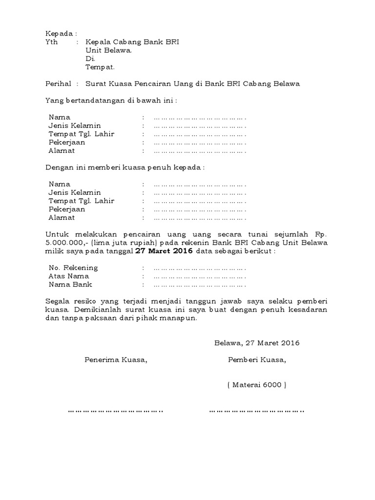 Preview Contoh Surat Kuasa Pengambilan Uang di Bank Mandiri versi Ms. Word Document:. Jangan lupa, tambahkan materai 6000 satu buah saja di tengah-tengah tanda tangan kedua belah pihak, dan ditandatangani oleh kedua belah pihak tersebut. PENCAIRAN DANA APBN. Penyampaian SPM dilakukan oleh petugas pengantar SPM yang sah dan ditetapkan oleh KPA dengan ketentuan sebagai berikut: Petugas pengantar SPM menyampaikan SPM beserta dokumen pendukung dan ADK SPM yang sudah diinjeksi dengan PINPPSPM melalui Front Office penerimaan SPM pada KPPN; Petugas pengantar SPM harus menunjukkan Kartu Identitas Petugas Satker (KIPS) pada saat ... 1. Surat Kuasa Perseorangan. Surat kuasa perseorangan merupakan surat kuasa yang dibuat oleh seseorang untuk mempercayakan urusan atau kepentingan pribadi kepada orang lain. Contohnya: surat kuasa pengambilan BPKB, surat kuasa pengambilan uang gaji pensiun, surat kuasa pengambilan ijazah dan lain-lain. 2. 1. Surat Kuasa Perorangan. Surat Kuasa untuk perorangan berlaku untuk pengambilan uang pribadi (bukan perusahaan). Misal, kalian menerima wewenang untuk mengambil uang milik Ayah, Ibu atau Saudara lain yang sudah tidak bisa melakukan transaksi tersebut di Bank.
