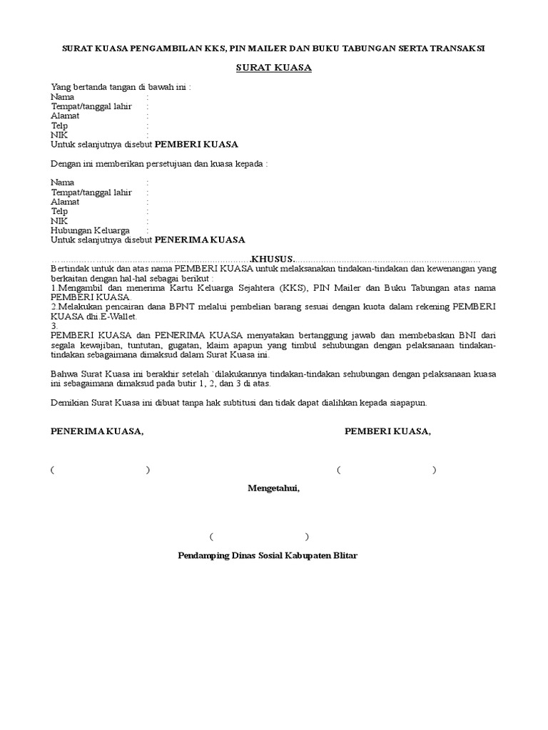 Contoh Surat Kuasa Untuk Mengambil Bantuan Sosial. Adapun mungkin persyaratannya yang bisa saja berbeda-beda diantaranya : Membawa Foto Copy KTP dan KK Pemberi kuasa dan penerima kuasa, Foto kopi kartu sejahtera dsb tergantung dari tempat pengambilan bansos didaerah masing-masing.
