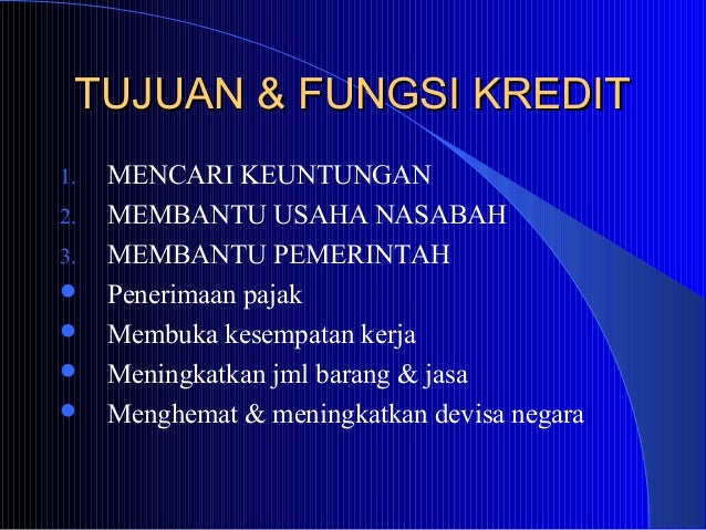 Tujuan dan fungsi kredit. Tujuan Dan Fungsi Kredit. Tujuan Dan Fungsi Kredit. Pemberian fasilitas kredit memilki beberapa tujuan yang tentunya tidak terlepas dari misi perusahaan tersebut didirikan, menurut Kashmir (2008 : 105 ) tujuan pemberian kredit anatara lain: l. Mencari keuntungan. Tujuan utama pemberian kredit adalah untuk memperoleh keuntungan, hasil keuntungan ... Semoga teman-teman dapat menerima dan bermanfaat bagi kita semua baik itu pengertian kredit, fungsi kredit, unsur-unsur kredit, macam-macam kredit, prinsip kredit, tujuan kredit, pengertian kredit menurut para ahli, manfaat kredit baik bagi debitur, bagi pemerintah, bagi bank, bagi masyarakat. Sekian dan terima kasih. Salam Berbagi Teman-Teman. Fungsi Kredit - Dari manfaat yang nyata dan juga manfaat yang diharapkan, maka kredit dalam kehidupan perekonomian dan perdagangan memiliki fungsi. Macam-macam fungsi kredit adalah sebagai berikut. Meningkatkan daya guna uang. Meningkatkan kegairahan berusaha. Meningkatkan peredaran dan lalu lintas uang. Pengertian, Fungsi, Tujuan dan Jenis Kredit Menurut Para Ahli - Dalam kehidupan sehari-hari kata kredit bukan merupakan perkataan yang tidak asing bagi masyarakat kita. Perkataan kredit tidak saja dikenal oleh masyarakat di kota-kota besar, tetapi sampai di desa-desa pun kata kredit tersebut sudah sangat populer.