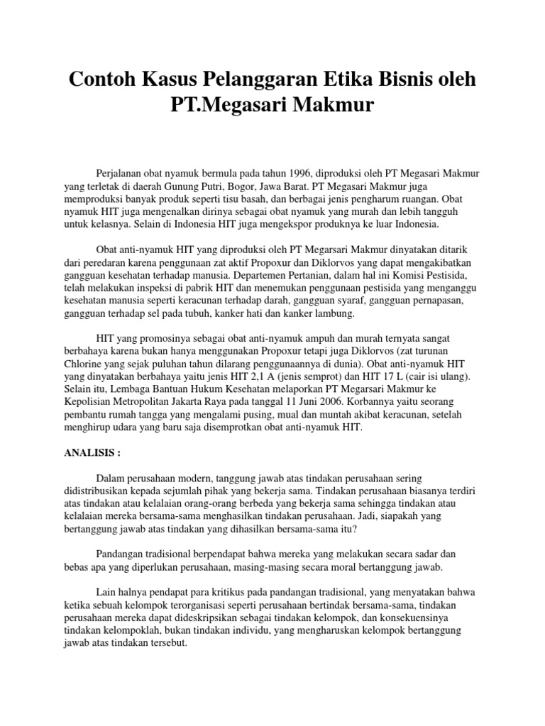 Kasus yang Berhubungan dengan Etika Bisnis Permasalahan dan Solusinya. Posted on January 2, 2016. by mayaahangga. Tanpa disadari, kasus pelanggaran etika bisnis merupakan hal yang biasa dan wajar pada masa kini. Secara tidak sadar, kita sebenarnya menyaksikan banyak pelanggaran etika bisnis dalam kegiatan berbisnis di Indonesia. Contoh makalah kasus pelanggaran etika bisnis dan solusinya. Krisis yang dialami bank century bukan disebabkan karena adanya krisis global tetapi karena disebakan permasalahan internal bank tersebut. 4 eb 13 npm. Kasus tersebut pun dapat berimbas kepada bank bank lain dimana masyarakat tidak akan percaya lagi terhadap sistem perbankan nasional. ... tinggi ( Contoh Masker ) bahkan banyak kasus — kasus lain bagaimana kondisi ini dengan etika Bisnis yang seharusnya ? Jelaskan dan berikan solusinya !