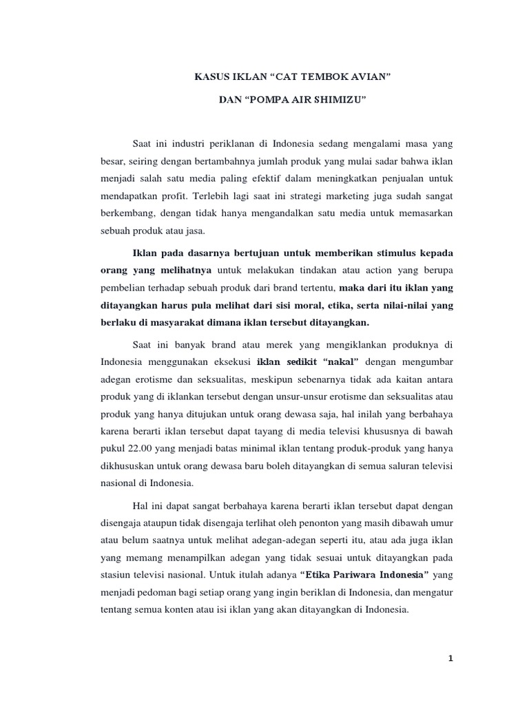 Contoh iklan yang melanggar etika bisnis. Iklan yang di nilai baik oleh semua konsumen dapat dilihat berdasarkan etika moral ataupun bisnis yang akan digunakan dan dipasarkan kepada khalayak ramai. Sudah menjadi hak kpi untuk menegur sejumlah iklan yang dianggap melanggar etika dalam beriklan. Etika periklanan secara umum jujur.