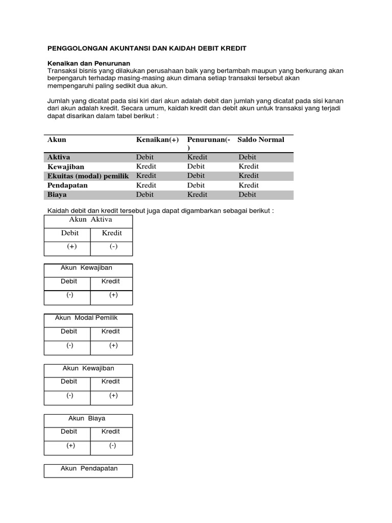 Debit dan kredit dalam akuntansi. Mekanisme Debet dan Kredit - Pencatatan transaksi keuangan harus menggunakan akun dan sesuai dengan mekanisme yang benar. Perkiraan/rekening/akun (account) adalah suatu formulir (alat) yang digunakan untuk mencatat penambahan dan pengurangan aktiva, kewajiban, modal, pendapatan, dan beban serta untuk menggolongkan transaksitransaksi yang sejenis. Baca Juga : Mengenal istilah Debit dan Kredit Dalam Akuntansi Contoh Debit dan Kredit Dalam Transaksi Umum. Berikut ini ada beberapa contoh debit dan kredit yang terdapat di transaksi umum perusahaan dagang atau yang lainnya, dan sering terjadi pada sebuah bisnis:. Menjual barang dagang secara tunai kepada pelanggan, maka akun debitnya adalah Kas, dan akun kreditnya adalah Pendapatan. Debit dan kredit dalam akuntansi menjadi sebuah elemen dasar yang penting untuk menyusun sebuah laporan keuangan yang benar. Selain itu dalam memasukkan data pada jurnal, debit dan kredit harus seimbang. Jika tidak maka dapat diambil kesimpulan bahwa ada kesalahan yang terjadi. Karena data debit dan kredit yang baik selalu disertai dengan kwitansi atau nota yang dapat dipercaya. Di dalam dunia akuntansi, istilah debit dan kredit memang banyak disebutkan. Dengan memahami bedanya debit dan kredit akuntansi, Anda dapat mengerjakan pembukuan secara benar dan tanpa kesalahan posting transaksi.