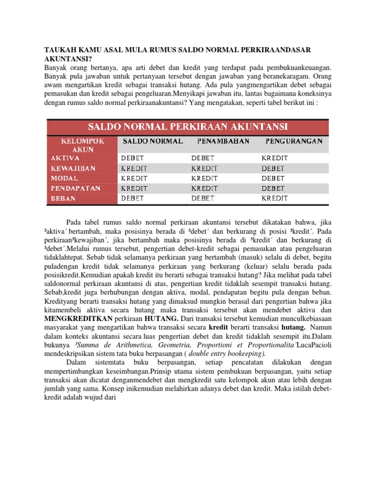 Penentuan debit dan kredit ini adalah modal utama dalam mengerjakan laporan keuangan. Nah kali ini saya akan menjelaskan tentang konsep debit dan kredit yang berlaku secara umum di perusahaan. Semoga apa yang saya sampaikan tentang konsep debit dan kredit ini bisa dipahami dengan mudah. Pengertian Debit. Debet dalam akuntansi berasal dari bahsa "Latin" yaitu "debere", melupakan lawan dari kredit.Kolom/posisi debet menunjukkan pertambahan nilai atau bersaldo normal bagi kelompok atau golongan akun aset dan beban. Sedangkan, bagi kelompok atau golongan perkiraan kewajiban (liability), ekuitas dan pendapatan yang berada di kredit, artinya transkasi tersebut mengalami ...