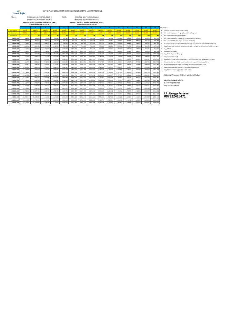 Tabel Pinjaman BJB 2019. Untuk memudahkan anda menghitung cicilan bulanan sekaligus menentukan jumlah pinjaman silakan simak tabel angsuran pinjaman Bank BJB di bawah ini. Dari simulasi di atas dapat kita lihat khusus pengajuan di bawah Rp 60 juta tenor pinjaman maksimum hanya 36 bulan. Selebihnya anda bisa memilih jangka waktu kredit hingga 60 ... Tabel Angsuran KTA Bank BJB Terbaru November 2021. Bank menjadi salah satu pilihan banyak orang untuk memenuhi kebutuhan dana mereka. terdapat berbagai jenis pinjaman yang di tawarkan oleh bank. Selain itu, dengan berbagai jumlah pinjaman , kamu juga bisa memilih berbagai jenis angsuran yang dapat kamu lakukan. Tabel angsuran kpr bank bjb modern januari 2021. Jangka waktu kredit di bank bjb adalah antara 5 10 hingga 15 tahun dan bunga yang berlaku adalah sebesar 1049. Bank bjb menjadi salah satu bank diberi kewenangan oleh pemerintah untuk menyalurkan dana dari program kur tersebut. Dapatkan pinjaman mulai rp 50 juta hingga rp 500 juta dengan tenor ...