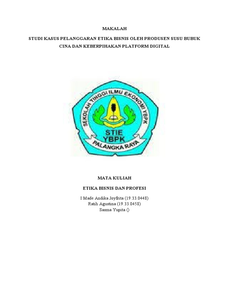 MAKALAH “ETIKA PROFESI BISNIS” OLEH : KELAS C (TEKNIK INFORMATIKA) KELOMPOK 5 PUTU HENDRAWATI 152125 FAJRIYANI AMALIA 152145 PUTU DARMAYANTI 152142 NUR ASNITA EKA MUSRIFAH TAQWA 152111 INDAH MUSTIKA FEBRIANTI 152106 SEKOLAH TINGGI MANAJEMEN INFORMATIKA DAN KOMPUTER STMIK DIPANEGARA MAKASSAR 2017 KATA PENGANTAR Segala puji dan syukur penulis panjatkan kehadirat Allah SWT, karena hanya atas ...