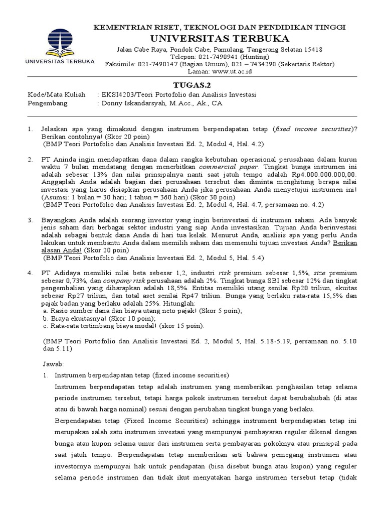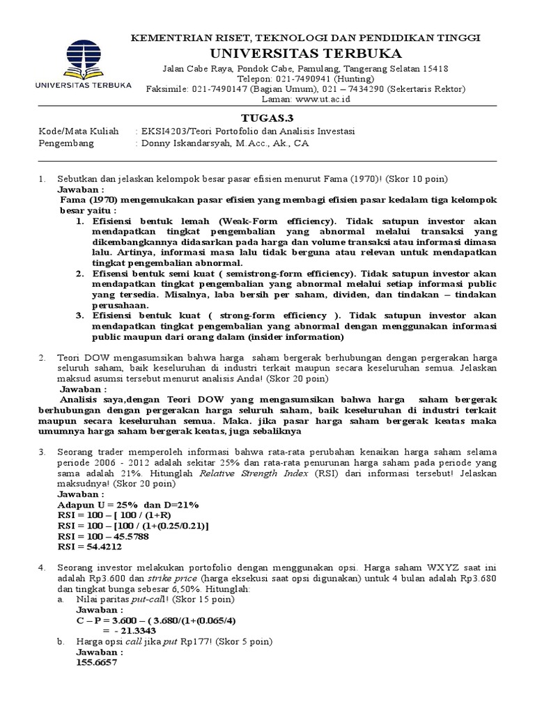 Soal Ujian Ut Akuntansi Eksi4203 Teori Portofolio Dan Analisis Investasi Dan Kunci Jawaban Soalut Com