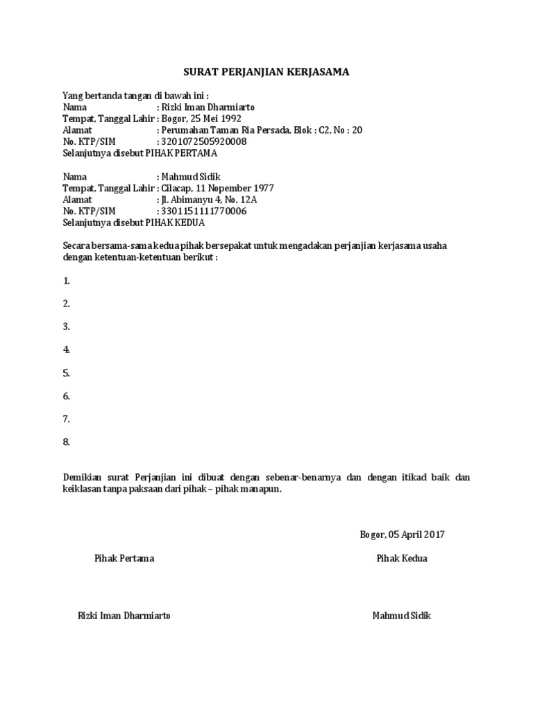 Agustus 16, 2021. Contoh Surat Perjanjian Kerjasama Investasi - Kesepakatan baik itu antar perorangan maupun perusahaan dibutuhkan adanya perjanjian tertulis untuk mengikat kedua belah pihak mengenai hak dan kewajiban masing-masing. Contoh surat perjanjian kerjasama investasi berikut ini akan memaparkan bagaimana format surat yang benar.