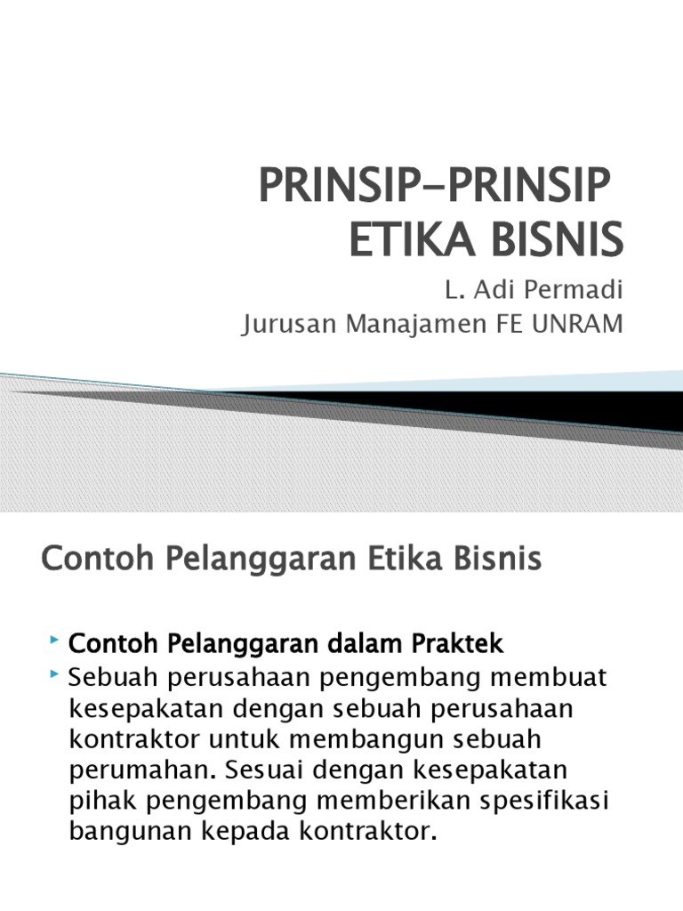 Prinsip Etika Bisnis Yang Wajib Diketahui — Prinsip etika bisnis dalam sebuah tindakan perlu diterapkan karena ini adalah suatu keharusan yang dipegang teguh oleh semua aspek dengan perusahaan. Hal ini diambil dari prinsip etika bisnis yang diatur oleh hukum, bahkan merupakan standar lebih tinggi dibandingkan standar minimal ketentuan hukum, karena kegiatan bisnis seringkali ditemukan di ... Prinsip prinsip etika bisnis 1. Sonny Keraf (1998) 1. Otonomi 2. Kejujuran 3. Keadilan 4. Saling Menguntungkan (mutual benefit principle) 5. Integritas Moral Main page 2. Ada tujuh Prinsip yang dideklarasikan: 1. Tanggung jawab bisnis 2. Dampak ekonomi dan social bisnis 3. ... Apr 07, 2020 · Namun, prinsip-prinsip etika dalam berbisnis pun perlu dan wajib untuk dipenuhi secara sadar. Baik terhadap relasi bisnis maupun dengan para anggota internal perusahaan. Bisnis merupakan ujung tombak kehidupan bangsa. Dimana dalam berbisnis kedua belah pihak haruslah mendapat manfaat serta keuntungan dari bisnis yang terjalin. Prinsip-prinsip Etika Bisnis Etika bisnis memiliki prinsip-prinsip yang bertujuan memberikan acuan cara yang harus ditempuh oleh perusahaan untuk mencapai tujuannya. Menurut Sonny Keraf (1998), terdapat lima prinsip yang dijadikan titik tolak pedoman perilaku dalam menjalankan praktik bisnis, yaitu (Agoes & Ardana, 2009:127-128): a. Prinsip Otonomi