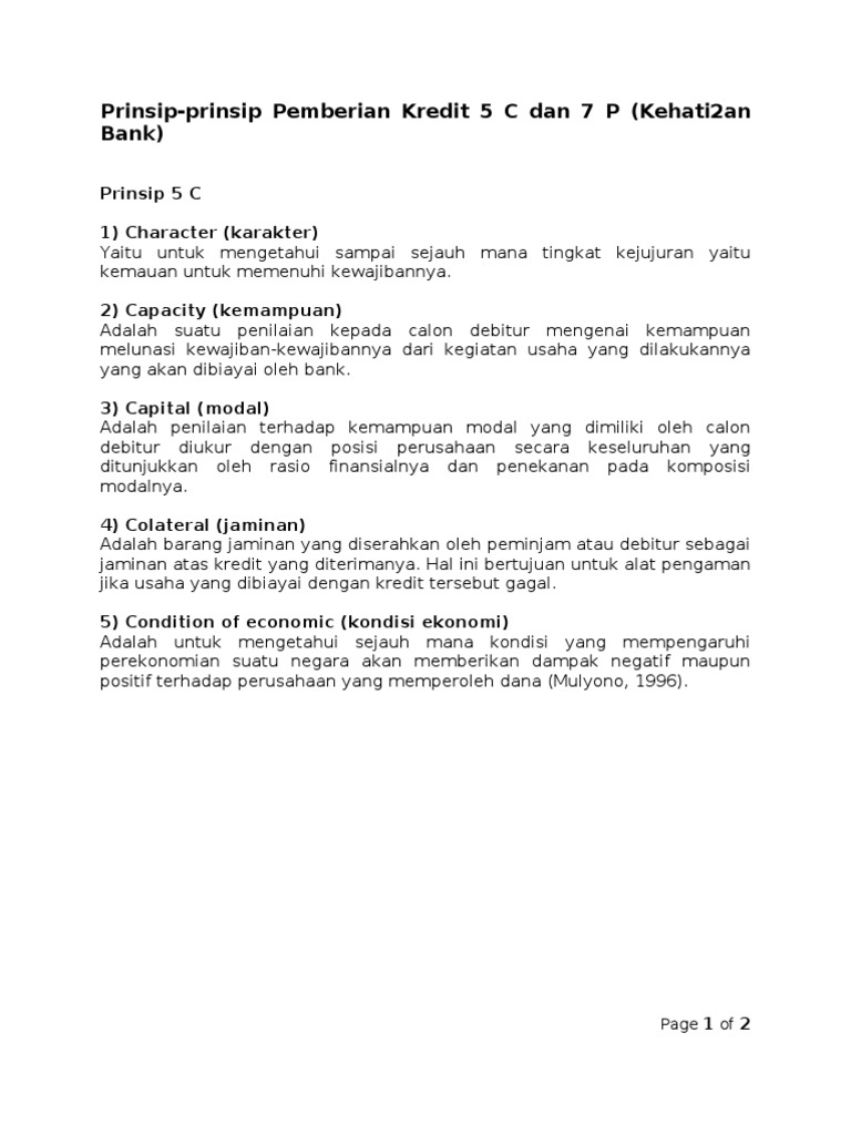 Mengenal Prinsip 5C Pemberian Kredit . Prinsip 5C merupakan sistem yang digunakan bank atau pemberi pinjaman lainnya untuk mengukur kelayakan kredit dari seorang calon debitur (peminjam). 5C ini adalah Character, Capacity, Capital, Condition dan Collateral. Bank Indonesia (BI) menambahkan faktor C ke-6, yaitu constraint – Batasan/hambatan yang ... Hukum kredit , dalam Prinsip Pemberian Kredit 5C terdapat pengertian kredit berdasarkan Undan g-Undan g No 14 tahun 1976 tentang pokok-pokok perbankan .Beberapa pengertian lainnya. Kredit adalah penyediaan uang atau tagihan yang dapat dipersamakan dengan itu, berdasarkan persetujuan atau kesepakatan pinjam meminjam antara bank dengan pihak lainnya mewajibkan pihak peminjam untuk melunasi hutangnya ... Analisis 5c Dan 7p Dalam Penilaian Kredit Perbankan . Maaf yaa kualitasnya kurang bagus dikarenakan banyak halangannya. Kelompok 3 Nama : - Maylia Dwi Nanda - Fariska Ananda Nadira - Hartini Setyowinarsih ...