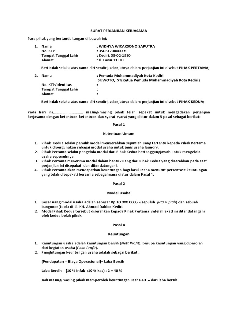 Contoh kontrak kerjasama bisnis. April 5, 2021 - Kontrak kerjasama usaha sebenarnya bukanlah merupakan hal yang asing. Sebab tentunya setiap pengusaha atau pebisnis pernah mengadakan kerjasama dengan pihak lain. Kerjasama biasanya diwujudkan dengan tujuan untuk saling mempermudah para pengusaha dalam mencapai tujuan bisnisnya. Contoh surat perjanjian kerjasama melakukan sebuah hubungan bisnis merupakan kegiatan dilakukan oleh kedua belah pihak bisanya salah satu pihak menjadi seorang investor atau pemodal sedangkan pihak satunya lagi merupakan pihak yg mengelola modal tersebut. Ketentuan umum waktu berlaku kontrak waktu kerja serta upah yang. Dalam membuat kontrak, Anda harus teliti dan lihat kembali isi kontrak. Berikut hal penting yang harus diperhatikan dalam pembuatan kontrak untuk melindungi bisnis, surat perjanjian kerja sama usaha dibutuhkan ketika memutuskan mencari rekan bisnis. Apa yang harus diperhatikan?