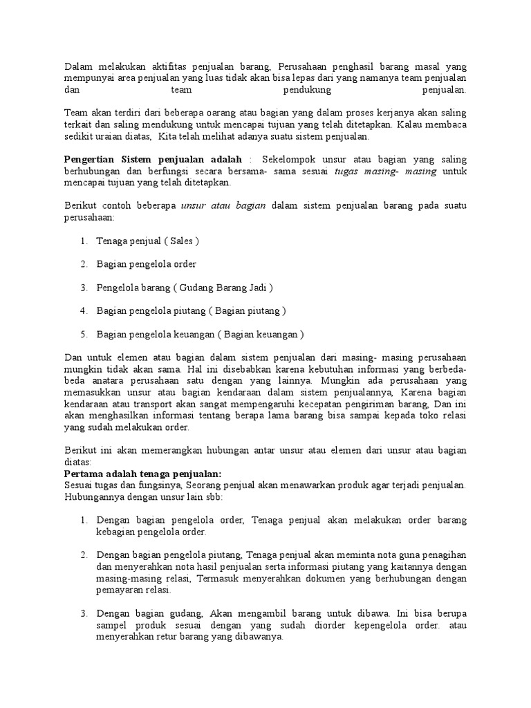 TUJUAN SISTEM PENJUALAN. Tujuan sistem penjualan adalah: Mencatat order penjualan dengan cepat dan akurat. Memastikan bahwa perusahaan menjual kepada konsumen yang memang layak menerima kredit (sehingga kalau boleh, tidak ada kredit macet) Memastikan bahwa konsumen menerima kiriman produk dan jasa tepat waktu, sesuai yang dijanjikan. Makalah penelitian sistem akuntansi penjualan kredit pt planet cash credit oleh. Untuk mengelola data kredit penggunaan program dan aplikasi dapat mempermudah manajemen pembelian barang kredit. Fungsi penjualan fungsi ini bertanggung jawab untuk menerima order dari pelanggan mengedit order dari pelanggan meminta otorisasi kredit menentukan ... sistem terkomputerisasi adalah: 1. Dengan sistem usulan ini dapat mempercepat pencarian data. 2. Menghindari bertumpuknya arsip yaitu arsip yang biasa disimpan di lemari, kini dalam harddisk komputer. 3. Dapat mempercepat semua pekerjaan khususnya yang berkaitan dengan sistem penjualan barang dengan menghasilkan makalah sistem informasi penjualan SISTEM INFORMASI PENJUALAN System Informasi Penjualan adalah sub system informasi bisnis yang mencakup kumpulan procedure yang melaksanakan, mencatat, mengkalkulasi, membuat dokumen dan informasi penjualan untuk keperluan manajemen dan bagian lain yang berkepentingan, mulai dari diterimanya order penjualan ...