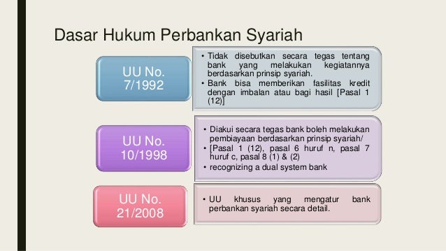 Dapat kita lihat digambar bahwa landasan hukum bank syariah berawal dari UU No 7/92 tentang perbankan yang hanya mengatur tentang perbankan secara konvensional, kemudian Bank Syariah sendiri dalam system operasinya UU tersebut dijadikan sebagai landasan hukumnya ditambah Peraturan Pemerintah nomor 72 tahun 1992 tentang Bank berdasarkan Bagi Hasil. May 05, 2021 · Pengertian dan Dasar Hukum Perbankan Syariah 05 May 2021 Kata hukum ( al-hukm ) secara bahasa bermakna menetapkan atau memutuskan sesuatu, sedangkan pengertian hukum secara termonologi berarti menetapkan hukum terhadap segala sesuatu yang berkaitan dengan perbuatan manusia, dalam perihal ini berarti penetapan hukum yang berkaitan dengan perbankan. Bank-bank swasta yang mapan pun makin banyak yang membuka window syariah. Buku ini hadir untuk mengiringi perkembangan itu, dengan menyajikan pembahasan mendalam dan luas mengenai semua aspek dalam manajemen bank syariah. Dasar Hukum Gadai – Undang undang dan Syariah. Reviewed by Yuli SE., MM. by Ahmad Dian November 13, 2016. Gadai merupakan salah satu kegiatan ekonomi yang dilandasi oleh beberapa faktor terutama kebutuhan manusia akan kehadiran uang maupun emas dan lainnya. Kita tahu di Indonesia telah banyak menyebar pegadaian-pegadaian baik di kota maupun ...