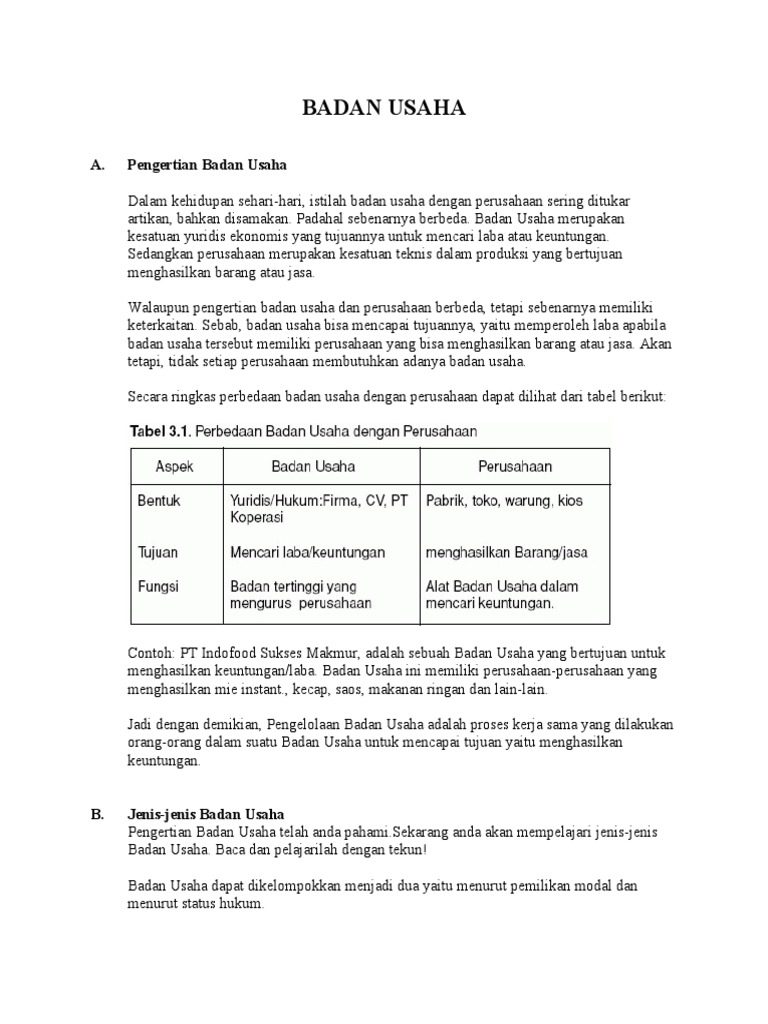 Dec 08, 2012 · Perseroan terbatas (Naamloze Venootschap) atau biasa disebut dengan PT, adalah badan usaha yang modalnya terdiri dari saham-saham, yang pemiliknya memiliki bagian sebanyak saham yang dimiilkinya. Karena modalnya berupa saham-saham yang dapat diperjualbelikan, maka kepemilikan dapat berganti-ganti tanpa adanya pembubaran perusahaan. Sebetulnya apa sih bedanya antara Badan Usaha dan Perusahaan? Singkatnya, badan usaha adalah lembaga, sementara perusahaan adalah tempat di mana Badan Usaha tersebut mengelola faktor-faktor produksi. Oops! We could not locate your form. Badan Usaha merupakan kesatuan yuridis atau hukum, teknis dan ekonomis yang bertujuan mencari laba atau keuntungan. Meskipun sering disamakan dengan perusahaan, sesungguhnya mereka adalah dua hal yang berbeda.