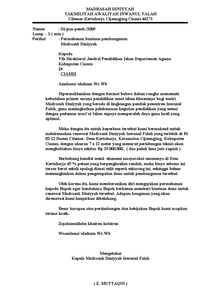 Contoh proposal permohonan dana pembangunan. Nah itu tadi contoh proposal pengajuan dana kegiatan sekolah pramuka yang bisa teman-teman jadikan referensi. Selain contoh proposal pengajuan dana kegiatan sekolah di atas, teman-teman juga bisa membuat ontoh proposal pengajuan dana kegiatan Pramuka lainnya kok. Selamat mencoba teman-teman. 6. Contoh Proposal Pengajuan Dana ke Bupati Contoh proposal permohonan bantuan dana usaha dari pemerintah usaha kelompok atau pribadi pada kesempatan kali ini saya akan memberikan contoh pembuatan proposal untuk permohonan bantuan dana yang ditujukan untuk pemerintah setempat yang ditujukan kepada bapak gubernur untuk mendapatkan modal usaha baik itu usaha kelompok ataupun usaha pribadi. PROPOSAL PERMOHONAN 2016 BANTUAN DANA PEMBANGUNAN MADRASAH DINIYAH NURUL IMAN DUSUN CIKULU DESA SUKAHURIP KECAMATAN PANGANDARAN KABUPATEN CIAMIS A. PENDAHULUAN Puji syukur kita panjatkan kepada Allah SWT, Sholawat dan salam semoga senantiasa terlimpah curahkan kepada Nabi Muhammad SAW. Contoh Proposal Bantuan Dana Paling Lengkap. Pada umumnya struktur pembuatan proposal bantuan dana hampir sama untuk semua jenis kepentingan. Unsur yang perlu dicantumkan dalam pembuatan proposal tersebut antara lain, surat pengantar dari pihak yang mengajukan, judul proposal, pendahuluan atau latar belakang, maksud dan tujuan, pelaksanaan ...