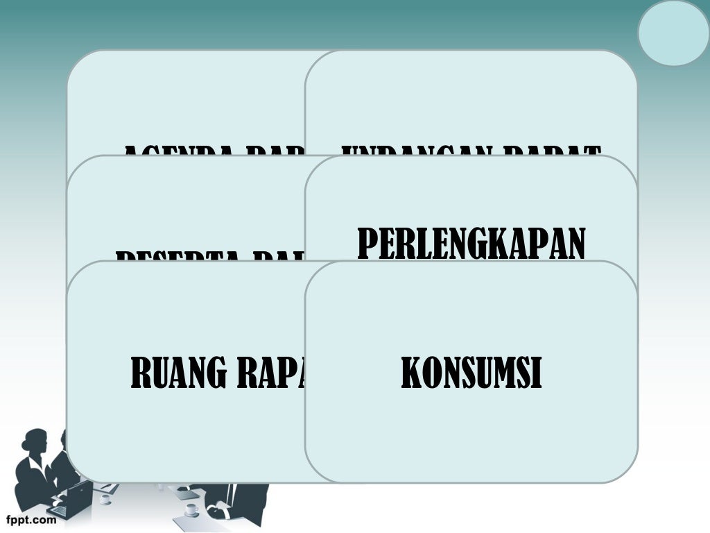 Feb 4, 2020 — Aspek terakhir persiapan yang tidak kalah pentingnya ialah fasilitas. Fasilitas rapat mencakup tempat (termasuk pengaturan kursi, lingkungan ...