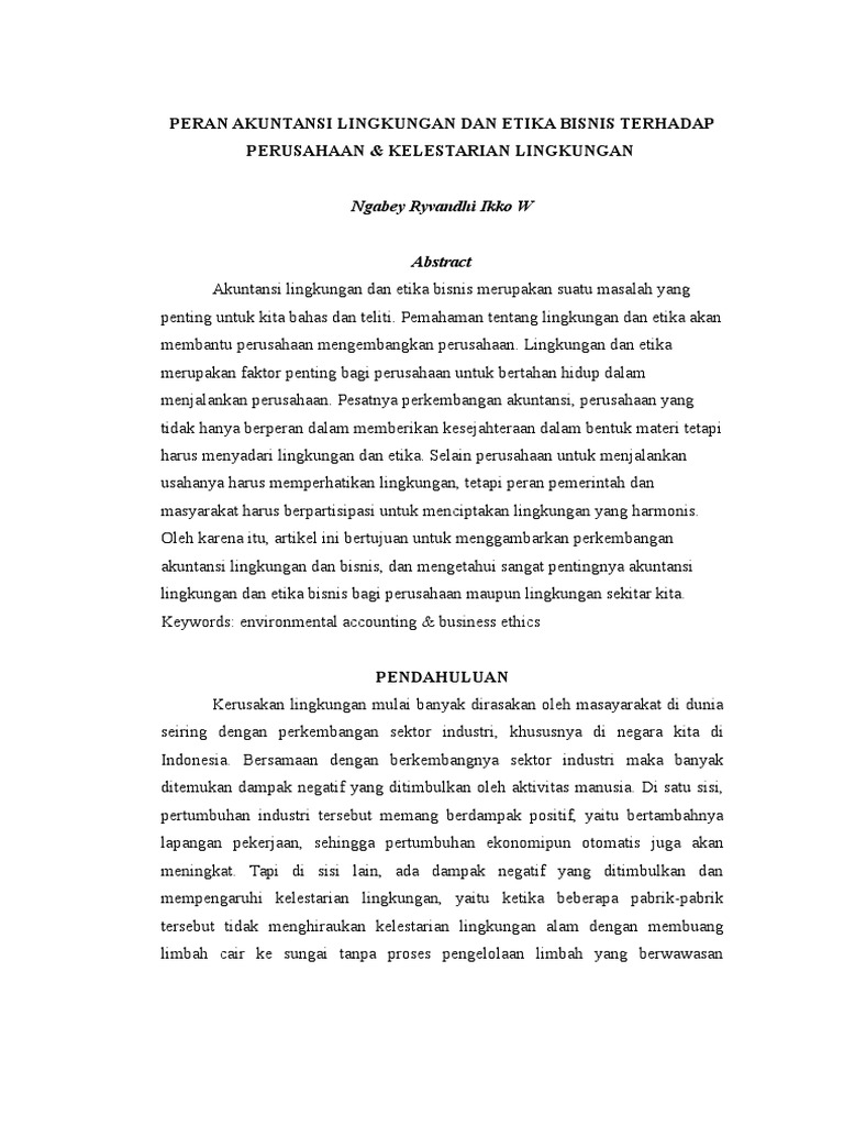 Jurnal tentang etika bisnis. Penelitian ini bertujuan untuk mengetahui peranan etika bisnis dalam perusahaan bisnis. Penelitian ini menggunakan metode kajian kepustakaan (library research), dimana kajian didasarkan pada pendapat- pendapat ahli tentang etika bisnis dan peranannya dalam perusahaan. Etika berbisnis ini bisa dilakukan dalam segala aspek. Saling menjaga kepercayaan dalam kerjasama akan berpengaruh besar ... 1.4 Maksud dan Tujuan Penulisan. Adapun tujuan penulisan ini untuk memenuhi tugas mata kuliah Etika Bisnis dalam membuat jurnal atau tulisan mengenai Etika Bisnis. Maksud dari penulisan ini adalah : 1. Untuk mengetahui mengapa etika sangat penting dalam menjalankan bisnis perusahaan. Jurnal Ekonomi MODERNISASI 7(2) DOI: ... (CSR), sering dianggap sebagai inti dari etika, kewajiban bisnis perusahaan di samping tugas hukum dan ekonomi, adalah untuk mencapai tujuan jangka panjang ... mengatur tentang perilaku profesional (Agoes, 2004:36 - 37). Tanpa etika, profesi akuntan tidak akan ada karena fungsi akuntan adalah sebagai penyedia informasi untuk proses pembuatan keputusan bisnis oleh para pelaku bisnis. Etika profesi merupakan karakteristik suatu profesi yang membedakan suatu profesi dengan