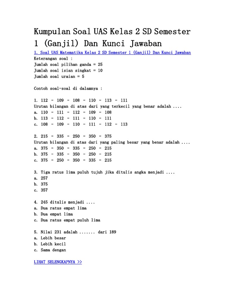 Makalah materi Soal Matematika Kelas 2 SD diterangkan mulai dari pengertian, jenis, fungsi, struktur, unsur, tujuan, makna, konsep, dan contoh lengkapnya. Download Soal MTK Kelas 2 File Word (Docx). Contoh Soal Matematika Kelas 2 Untuk Sekolah Dasar Semester 1.