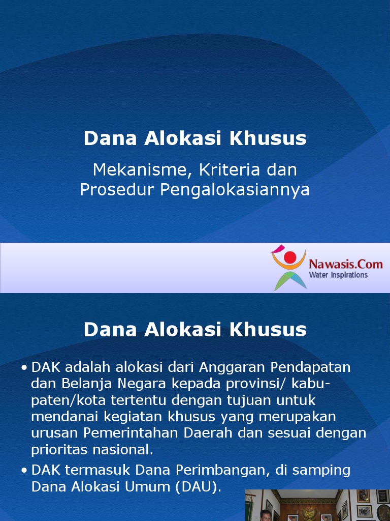 Pengertian Dana Alokasi Khusus dan Pengaturan-nya - Jasa ... Dana Alokasi Khusus, selanjutnya disebut DAK, adalah dana perimbangan dan bersumber dari pendapatan APBN yang dialokasikan kepada daerah tertentu de ngan tujuan untuk membantu mendanai kegiatan khusus yang merupakan urusan daerah dan sesuai dengan prioritas nasional: