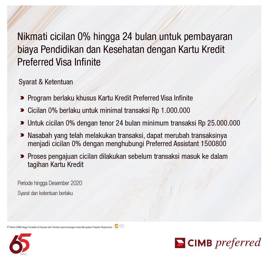 Ketidakjelasan Aplikasi Kartu Kredit Bank CIMB Niaga « Jaranguda Alasan saya mengajukan kartu kredit CIMB Niaga hanya karena free annual fee for life (bebas biaya iuran tahunan), akhirnya tadi siang saya menghubungi call center dan meminta aplikasi pengajuan kartu kredit saya dibatalkan (kata mbak call center CIMB Niaga, ada kemungkinan data saya masih... 4 Cara Cek Limit Kartu Kredit CIMB Niaga [2022] Pasalnya limit kartu CIMB Niaga perlu di cek jumlah sisanya agar pengguna tidak melakukan transaksi melebihi batasan. Limit tiap kartu CIMB Niaga Limit tiap kartu CIMB Niaga memang berbeda, tapi tahukah Anda jika cara cek limit semua jenis kartu tersebut itu sama. Hal ini dilakukan oleh pihak... Permbayaran Tagihan Kartu Kredit CIMB Niaga - Pengumuman | BNI Terhitung mulai tanggal 28 Mei 2020, layanan Pembayaran Tagihan Kartu Kredit CIMB Niaga hanya dapat dilakukan melalui menu Transfer Online Antar Bank pada e-Channel BNI (Mobile Banking, SMS Banking, Internet Banking, ATM & Mini ATM, Agen46) dengan cara : 1. Pilih CIMB Niaga atau...