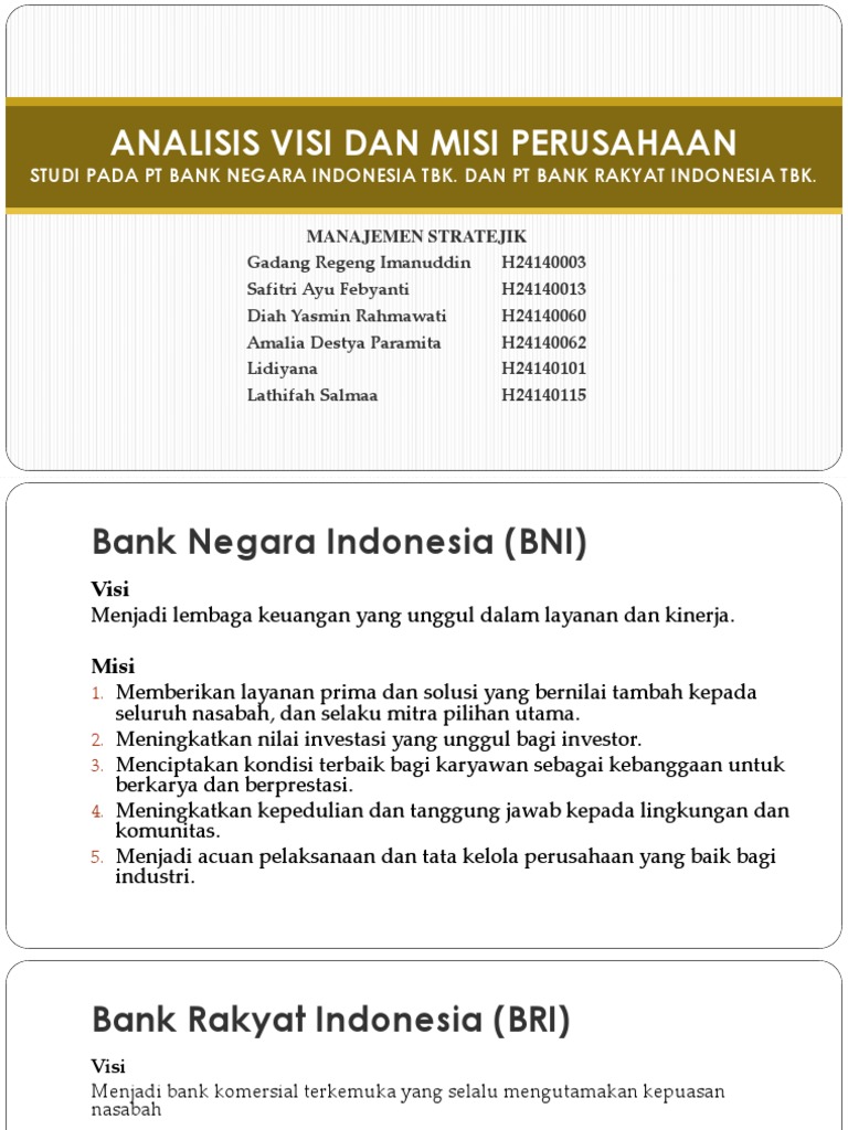 Sejarah dan Visi Misi Bank Rakyat Indonesia (BRI ... Bank Rakyat Indonesia (Persero) Tbk., yang masih digunakan sampai dengan saat ini. Visi dan Misi Visi BRI Menjadi bank komersial terkemuka yang selalu mengutamakan kepuasan nasabah. Misi BRI Melakukan kegiatan perbankan yang terbaik dengan mengutamakan pelayanan kepada usaha mikro, kecil dan menengah untuk menunjang peningkatan ekonomi masyarakat.