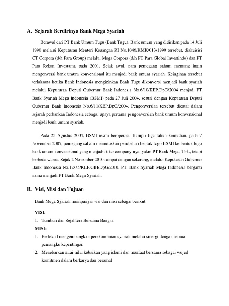 Visi & Misi - Bank Syariah Indonesia Misi. Memberikan akses solusi keuangan syariah di Indonesia. Melayani >20 juta nasabah dan menjadi top 5 bank berdasarkan asset (500+T) dan nilai buku 50 T di tahun 2025. Menjadi bank besar yang memberikan nilai terbaik bagi para pemegang saham. Top 5 bank yang paling profitable di Indonesia (ROE 18%) dan valuasi kuat (PB>2) Bank Muamalat Profil Bank Muamalat. Visi & Misi. Manajemen Muamalat. Dewan Pengawas Syariah. Dewan Komisaris. Direksi. Komite Audit. Komite Nominasi dan Remunerasi. Komite Tata Kelola Perusahaan.