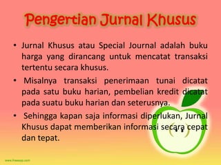 Jurnal Khusus : Pengertian, Manfaat, Jenis, Dan Contohnya Jurnal Khusus Pembelian yaitu buku harian khusus untuk mencatat sebuah transaksi-transaksi pembelian barang dagangan dan barang lainnya yang dilakukan secara kredit. Jurnal ini juga disebut dengan buku pembelian. Fungsinya : berfungsi untuk mencatat sebuah transaksi pembelian barang yang dilakukan dengan pembayaran kredit.
