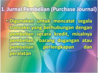 Blogger - tugas tik 1. Jurnal Pembelian (Purchase Journal) Jurnal pembelian digunakan untuk mencatat transaksi pembelian barang secara kredit. Perlu dijelaskan lebih lanjut apabila perusahaan dalam melakukan pembelian berupa barang-barang lain (selain barang dagang) dan jarang dilakukan maka pembuatan jurnal pembelian ini hanya khusus digunakan untuk mencatat ...