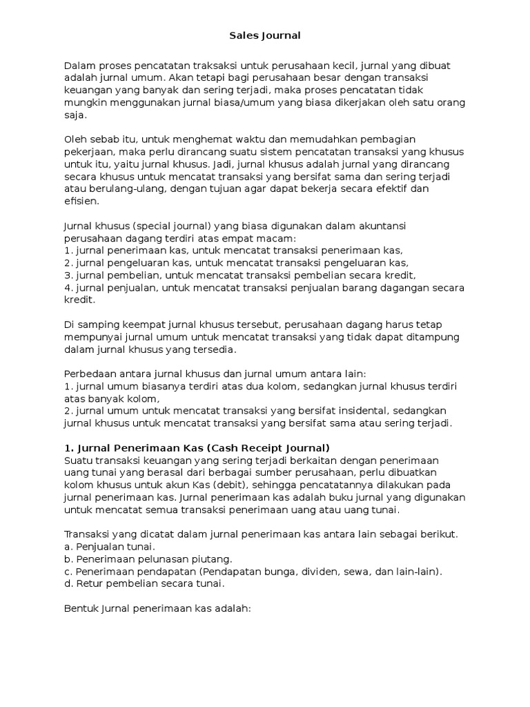 Jurnal Khusus Adalah: Pengertian, Jenis dan Manfaatnya Jurnal Penjualan Jurnal yang khusus digunakan untuk mencatat penjualan barang dagangan secara kredit (memungkinkan penjualan tunai juga dapat dicatat dalam jurnal ini). Jurnal Penerimaan Kas Jurnal yang digunakan untuk mencatat transaksi yang berkaitan dengan penerimaan kas baik berupa uang, cek ataupun bilyet giro.