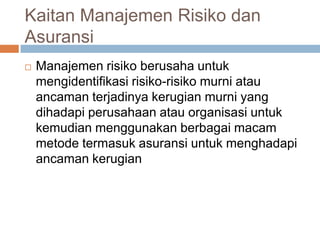 √ Apa Itu Asuransi Dan 8 Alasan Utama Mengapa Asuransi Itu ... 8. Bisa Untuk Manajemen Risiko. Asuransi menyediakan manajemen risiko yang efektif dalam hidup. Musuh utama kehidupan adalah ketidakpastian dan seseorang bisa merencanakan ketidakpastian dalam hidup dengan asuransi.