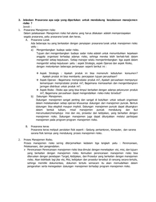 SOAL UJIAN TENGAH SEMESTER MANAJEMEN RESIKO DAN ASURANS1 b ... SOAL UJIAN TENGAH SEMESTER MANAJEMEN RESIKO DAN ASURANSI DOSEN: VINA MARIA OMPUSUNGGU. S.Sos., MSP Rabu, 08 April 2020 KELOMPOK B PILIHAN BERGANDA! 1. Yang dimaksud dengan risiko murni adalah.... Jawaban :Suatu situasi dimana hanya ada kemungkinan terjadi kerugian atau tidak terjadi kerugian 2. Yang dimaksud dengan risiko spekulatif adalah....