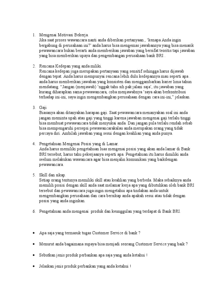 Motivasi Masuk BRI | PDF Motivasi masuk BRI? Ingin kerja di perusahaan yang punya tingkat kompleksitas tinggi, memberikan tantangan yang menguji kemampuan saya utk membuktikan diri dengan ilmu yg saya dapatkan selama ini. Selain itu, saya tertarik di BRI karena statusnya yang BUMN. 2. Yang kamu ketahui bisnis bank?