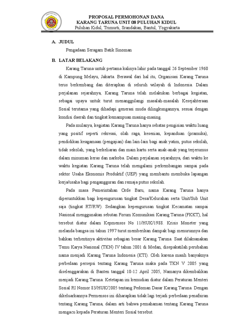 Proposal Karang Taruna Permohonan Bantuan Usaha Ekonomi ... Proposal Karang Taruna Permohonan Bantuan Usaha Ekonomi Produktif (UEP), sangat penting untuk organisasi Karang Taruna. Hal ini dikarenakan Proposal Karang Taruna Permohonan Bantuan Usaha Ekonomi Produktif merupakan salah satu jalan jitu untuk memajukan organisasi Karang Taruna dan seluruh anggotanya.