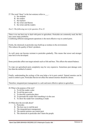 45 Soal Latihan UN/UNBK Bahasa Inggris Kelas XII Beserta ... 45 Soal Latihan UN/UNBK Bahasa Inggris Kelas XII Beserta Jawaban yang admin publish ini, berisikan materi soal bahasa Inggris kelas 12 semester genap tentang kinds of expression, narrative text dan grammar focus (baca: disini) sampai soal tentang speech, review text dan grammar focus (baca: disini).Walaupun materi soal-nya sama yang diambil dari Bab 1 dan 2, … Kumpulan Soal Matematika Sma Pdf Download soal un unbkunkp sma tahun 2019 pdf semua mapel kumpulan soal soal ujian nasional unbk dan unkp tahun 20182019 dapat di download melalui link di bawah ini filetype pdf. Latihan soal dan pembahasan matematika sma kelas x. Pembahasan soal ujian nasional matematika sma program studi ipa. Download Soal-soal UN SMA (Naskah Asli) - SMA Ahmad ... Download Soal-soal UN SMA (Naskah Asli). Ujian Nasional (UN) bukan lah hal yang bisa kita anggap sepele, meskipun BSNP setiap tahun mengeluarkan kisi-kisi ... Bank Soal UN Kimia SMA - Kimia Study Center Bank Soal UN Ikatan Kimia. Kimia Study Center – Kumpulan contoh soal ujian nasional kimia UN tahun 2002 – 2011, 2012 dan 2013, 2014 tentang ikatan kimia.