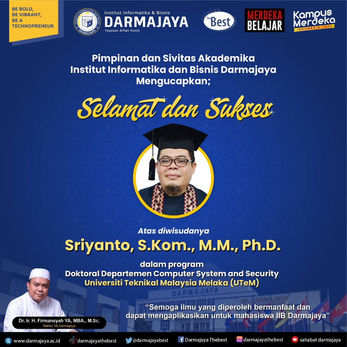 Institut Informatika dan Bisnis Darmajaya - Wikipedia ... Institut Informatika dan Bisnis Darmajaya (disingkat IIB Darmajaya) merupakan salah satu perguruan tinggi swasta yang ada di Kota Bandar Lampung, Provinsi Lampung.Nama "DARMAJAYA", merupakan akronim dari " Dharma Bhakti dan Jasa Yoenidar Alfian".Kampus Biru IIB Darmajaya dibangun di atas tanah seluas 2,5 hektar, Institut ini berdiri pada 05 Juni 1997 yang dahulu disebut dengan nama STMIK-STIE ...