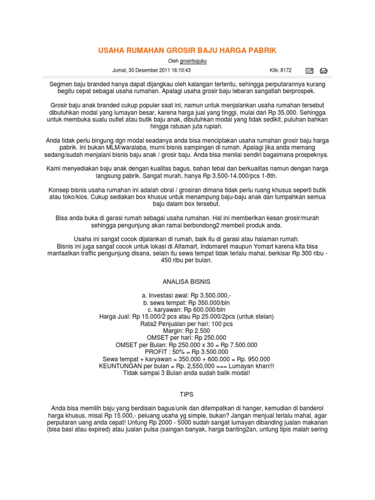 Bisnis pakaian murah harga pabrik. Grosir baju Makassar | Bisnis Baju Murah - Blogger Bisnis Baju Murah 5ribu Grosir Baju Terkenal paling murah se-Dunia sejak 2008 dengan puluhan cabang dan ribuan reseller tersebar diseluruh indonesia. Cocok sebagai Peluang Usaha Rumahan. BUKTIKAN harga 3500-14ribu Langsung dari Pabrik. visit: atau [Klik Disini Selengkapnya] PUSAT BAJU MURAH DI MAKASSAR Tahta Collection Grosir Baju Anak Murah Lokal dan Import Harga Langsung ... Jadi Buat apa jauh-jauh ke pasar grosir tanah abang kalau KAMI LEBIH MURAH. Kami menyediakan baju anak dengan kualitas bagus, bahan tebal dan berkualitas namun dengan harga langsung pabrik. Sangat murah, ukuran mulai 1-10th. Usaha ini cocok sebagai alternative Peluang Usaha Rumahan Grosir Baju Anak Murah Langsung Dari Pabrik. Bisnis Pakaian Murah Harga Pabrik - Pabrik Konveksi Bisnis Yang Menjanjikan. Pakaian murah harga pabrik memang sangat digemari oleh semua kalangan. Tidak hanya orang dari kalangan bawah saja yang banyak mencari jenis pakaian yang memiliki harga yang miring ini, namun mereka yang berasal dari kalangan orang berada juga banyak yang mencari jenis pakaian ini untuk digunakan dalam berbagai kesempatan. Peluang Bisnis Grosir Baju Dari Pabrik Harga Termurah Karena Langsung Pabrik. Kaos Oblong dan Kragh/wingky dengan bahan tebal & tidak panas, nyaman di pakai Sangat laris di pasaran. ... ANALISA BISNIS " GROSIR BAJU ANAK LANGSUNG DARI PABRIK " a. Investasi awal: Rp 3.000.000,- b. Sewa tempat: Rp 350.000/bln c. Gaji Karyawan: Rp 400.000/bln Harga Jual: Rp 8.500 atau Rp 25.000/3 pcs ...