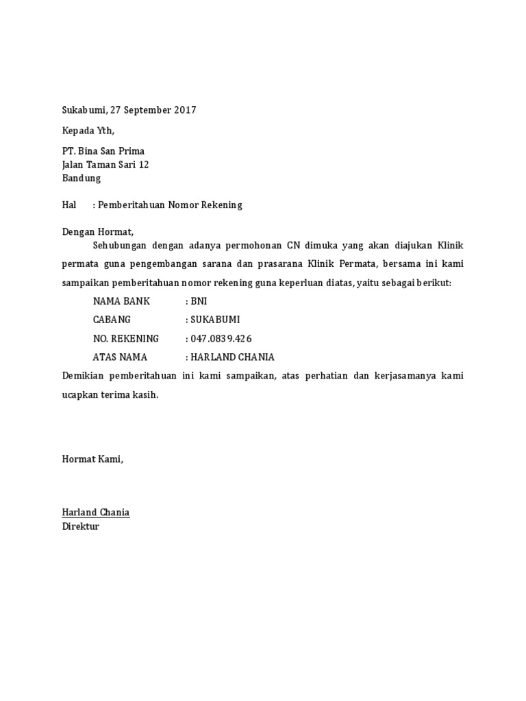 Contoh surat pemberitahuan nomor rekening bank perusahaan