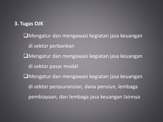 Pengertian OJK Adalah, Fungsi, Tujuan, dan Tugasnya Mengatur dan mengawasi kegiatan jasa keuangan di sektor Pasar Modal. Mengatur dan mengawasi aktivitas jasa keuangan di sektor Asuransi, Dana Pensiun, Lembaga Pembiayaan, dan Lembaga Keuangan Lainnya. 2. Wewenang OJK. Berikut ini adalah beberapa wewenang OJK dalam tugas pengaturan dan tugas pengawasan: