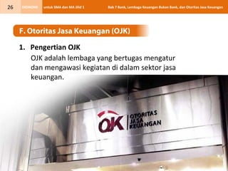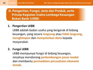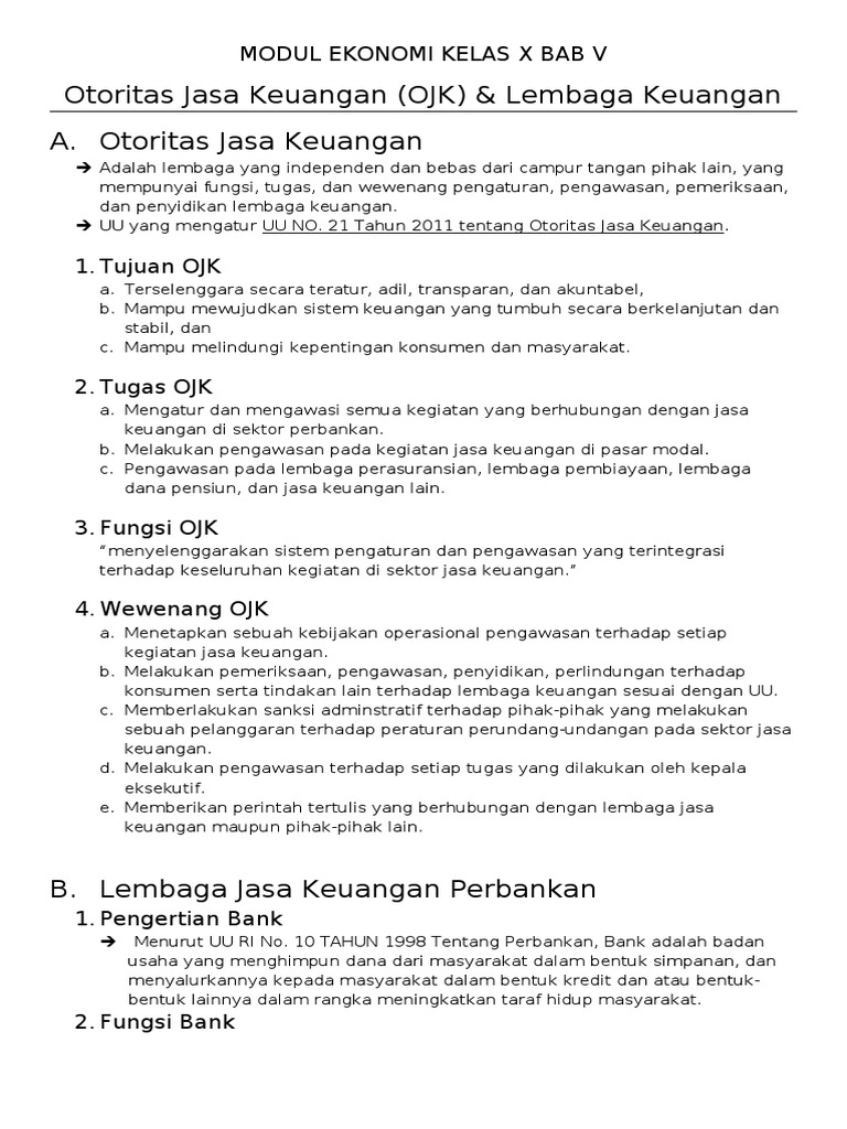 Bank, Lembaga Keuangan Bukan Bank Dan Ojk (Otoritas Jasa ... BANK, LEMBAGA KEUANGAN BUKAN BANK DAN OJK (OTORITAS JASA KEUANGAN) Bank Jenis-Jenis Bank a. Bank Sentral Fungsi bank sentral adalah sebagai bank dari pemerintah dan bank dari bank umum (banker's bank), sekaligus untuk mencapai dan memelihara kestabilan nilai rupiah. Adapun tugas bank sentral antara lain sebagai berikut. 1. Menetapkan dan melaksanakan kebijakan moneter. Lembaga Keuangan Bukan Bank (LKBB): Pengertian, Fungsi ... Sebenarnya, ada cukup banyak fungsi Lembaga Keuangan Bukan Bank di Indonesia. Secara umum, fungsi dan tujuan LKKB adalah sebagai berikut: Menghimpun dana dari masyarakat dengan cara menerbitkan surat-surat berharga, lalu menyalurkan kembali dana tersebut untuk membiayai permodalan bagi perusahaan-perusahaan yang membutuhkan. 39 jelaskan wewenang ojk dalam mengatur dan mengawasi bank ... Soal dan jawaban tentang bank, LKBB (Lembaga Keuangan Bukan Bank), dan OJK (Otoritas Jasa Keuangan) - Ketika kita berbicara tentang kegiatan prekonomian suatu negara, maka kita tidak akan lepas dari peran perbankan, LKBB, dan OJK.Ketiga lembaga tersebut mempunyai peran vital dalam rangka menjaga perekonomian di negara. Wewenang dan Tugas Otoritas Jasa Keuangan (OJK) Dalam ... OJK kepanjangan dari Otoritas Jasa Keuangan yang bertugas untuk mengatur, mengawasi, memeriksa bahkan melakukan penyidikan terhadap segala bentuk transaksi yang dilakukan oleh pihak dan lembaga jasa keuangan seperti Perbankan, Asuransi, Sekuritas dan lain sebagainya.