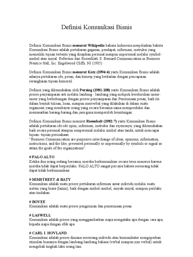 Apa Itu Komunikasi Bisnis? Berikut Pengertian, Teknik, dan ... Bisa dikatakan komunikasi jenis ini sangat penting untuk perusahaan karena dapat menentukan kelancaran suatu bisnis berjalan. Komunikasi bisnis adalah sebuah tindakan dimana terjadi pertukaran pendapat, informasi, instruksi dll yang dapat disampaikan dengan berbagai cara pula. Komunikasi Bisnis: Pengertian, Tujuan, Fungsi, Unsur, dan ... Pengertian komunikasi bisnis adalah suatu aktivitas pertukaran informasi, gagasan, pendapat, dan instruksi yang disampaikan secara personal atau impersonal melalui simbol-simbol atau sinyal tertentu sehingga didapatkan pemahaman yang sama antar pihak-pihak yang berkomunikasi.