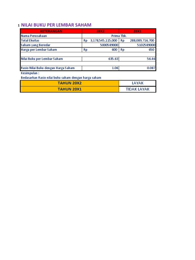 Cara Mudah Menghitung Nilai Buku Per Lembar Saham Proses menghitung nilai buku saham. Nilai buku saham per lembar: Prioritas = Rp. 1.150.000 : 1.000 lembar = Rp. 1.150. Biasa = Rp. 5.600.000 : 10.000 lembar = Rp. 560 Contoh #2: Perhitungan book value per share. Nilai likuidasi saham prioritas Rp. 1.100. Saham prioritas adalah kumulatif dan dividen yang belum dibayar adalah sejak tahun 2016