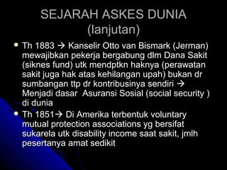 PDF Bab I Sejarah Asuransi Kesehatan edited Sejarah Asuransi Kesehatan di Dunia Sejak 1.000 tahun Sebelum Masehi masyarakat kuno telah mengenal prinsip dasar asuransi—yaitu yang dikenal dengan istilah "Hukum Laut". Dalam konsep hukum laut di Sejarah Askes Hasbullah Thabrany Page 2 jaman kuno, perahu-perahu mengalami kesulitasn mendarat akibat malam yang gelap gulita.