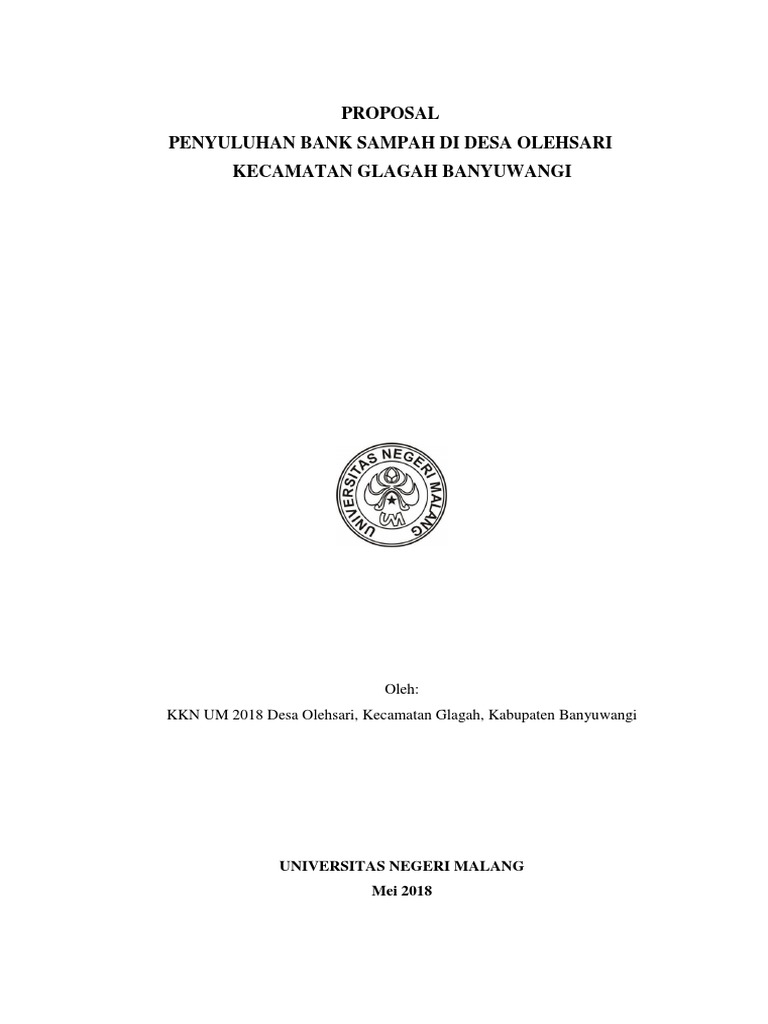 Proposal Bank Sampah [134wwvkkqz47] - idoc.pub Proposal Bank Sampah. A. JUDUL PROGRAM Judul dari program ini adalah: Bank Sampah sebagai solusi pengelolaan sampah bagi masyarakat di sekitar Universitas Riau B. LATAR BELAKANG MASALAH Sampah merupakan suatu bahan yang terbuang atau dibuang dari sumber hasil aktivitas manusia maupun proses alam yang belum memiliki nilai ekonomis. Proposal Kegiatan Bank Sampah - OSIS SMA Negeri 1 Balapulang Bertolak dari uraian di atas, kami Pengurus OSIS SMA Negeri 1 Balapulang bermaksud akan mengadakan kegiatan Bank Sampah yang ditujukan kepada seluruh siswa SMA Negeri 1 Balapulang. 2. Tujuan Kegiatan 1) Meningkatan kesadaran siswa akan kebersihan lingkungan 2) Mengurangi jumlah sampah organik dan non-organik yang ada di SMA Negeri 1 Balapulang Proposal Bank Sampah - Academia.edu TUJUAN Adapun tujuan dari program bank sampah ini adalah sebagai berikut: 1. Memecah permasalahan sampah di kampus yang sampai saat ini belum juga bisa teratasi dengan baik. 2. Meningkatkan kepedulian masyarakat akan pentingnya hidup bersih dengan pengelolaan sampah yang baik. Perkenalan: Proposal KKN Pengadaan Tong Sampah Perkenalan: Proposal KKN Pengadaan Tong Sampah Perkenalan Minggu, 02 Februari 2014 Proposal KKN Pengadaan Tong Sampah Written by Muin Arifah, Sragen Jawa Tengah mugal69@yahoo.co.id 75808605 PANITIA PENGADAAN TONG SAMPAH KULIAH KERJA NYATA (KKN) UNIVERSITAS NEGERI SEMARANG 2013 DESA LEGOKKALONG KEC. KARANGANYAR KABUPATEN PEKALONGAN PROPOSAL KEGIATAN